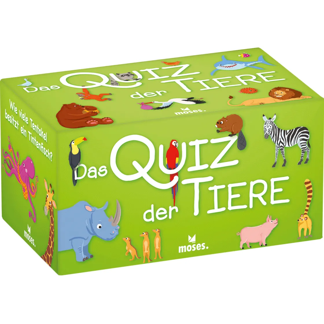 Geier, Elefanten oder Clownfisch: auf der Welt gibt es eine ganze Menge Tierarten. Die Fragen in diesem Quiz beschäftigen sich mit Tieren, von denen man sicherlich schon eine ganze Menge gehört hat, aber auch mit unbekannteren Lebewesen. Wie viele Bienen leben in einem Stock? Wie viel wiegt die Zunge des Blauwals? Jeder Spieler zieht je eine Karte aus jeder Kategorie und deckt diese auf. Bei einer Solo-Karte rät jeder alleine, bei einer Chance-Karte alle gemeinsam. Wer die richtige Antwort weiß, darf die Karte neben sich ablegen. Bei einer falschen Antwort muss man eine neue Karte ziehen. Wer zuerst alle seine Karten abgelegt und die meisten Karten auf seinem Ablagestapel hat, hat gewonnen. (Ab 8 Jahre, 2-6 Spieler)