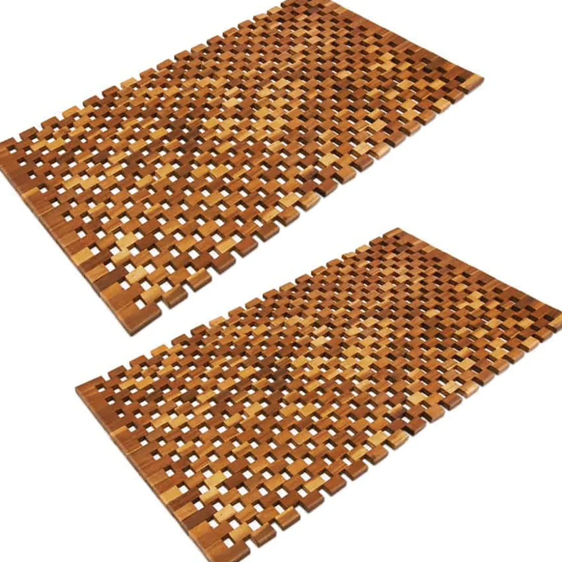 Eine Badematte aus Holz? Ja, tatsächlich hat dieses Material seine Vorteile: Akazienholz ist besonders hygienisch, weil keine Feuchtigkeit einzieht, wie zum Beispiel bei Baumwoll-Textilien, sondern das Wasser schnell von der Oberfläche verdunstet. Auch optisch kann ein Dusch- und Badewannen-Vorleger aus Holz es locker mit Textil-Matten aufnehmen. Sie erhalten die Badematte hier bei uns im 2er-Set, sodass Sie diese entweder vor zwei Waschbecken im Badezimmer legen können oder eine vor die Dusche und eine vor die Badewanne. Haben Sie eine Sauna? Dann können Sie die Matte aus Akazienholz auch dort vor die Tür legen. Die Reinigung der Matten stellt kein Problem dar, Sie können sie einfach hin und wieder feucht abwischen und dann trocknen lassen.