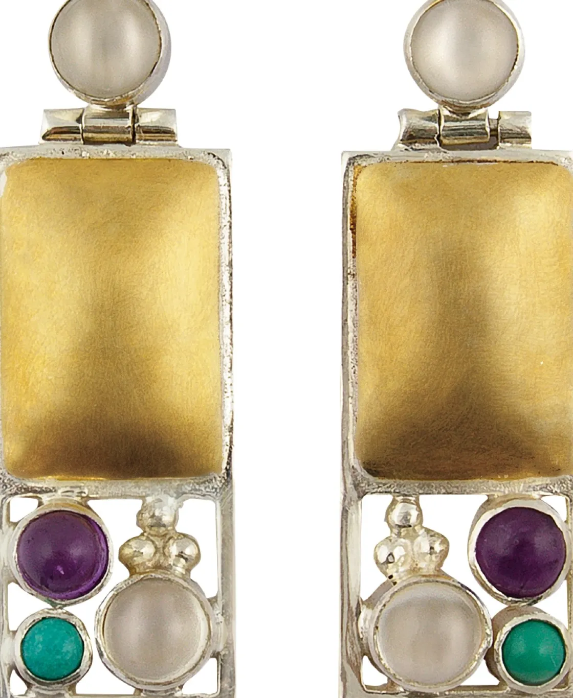 Diese geschmackvollen Ohrstecker sind eine zart schimmernde Hommage an die strukturierte Formensprache des Wiener Architekten und Secessionskünstlers Josef Hoffmann. Sie bestechen vor allem durch die Kombination von matt vergoldeten Flächen mit kleinen runden Schmucksteinen – Mondstein, Türkis und Cordierit bilden hier eine elegante farbige Einheit. Die britische Schmuckdesignerin Paula Bolton entstammt einer Familie von Kaufleuten, die seit dem 17. Jahrhundert vor allem den Fernen Osten bereisten. Sie selbst verbindet in ihren Entwürfen ihre Leidenschaften für Kunst und Geschichte miteinander; die daraus resultierenden Schmuckstücke werden in Handarbeit auf Bali gefertigt, von Handwerkern, deren Fertigkeiten über Generationen weitergegeben werden. Jedes Stück wird so zum Unikat, das durch die verwendeten Schmucksteine zusätzlich veredelt wird.