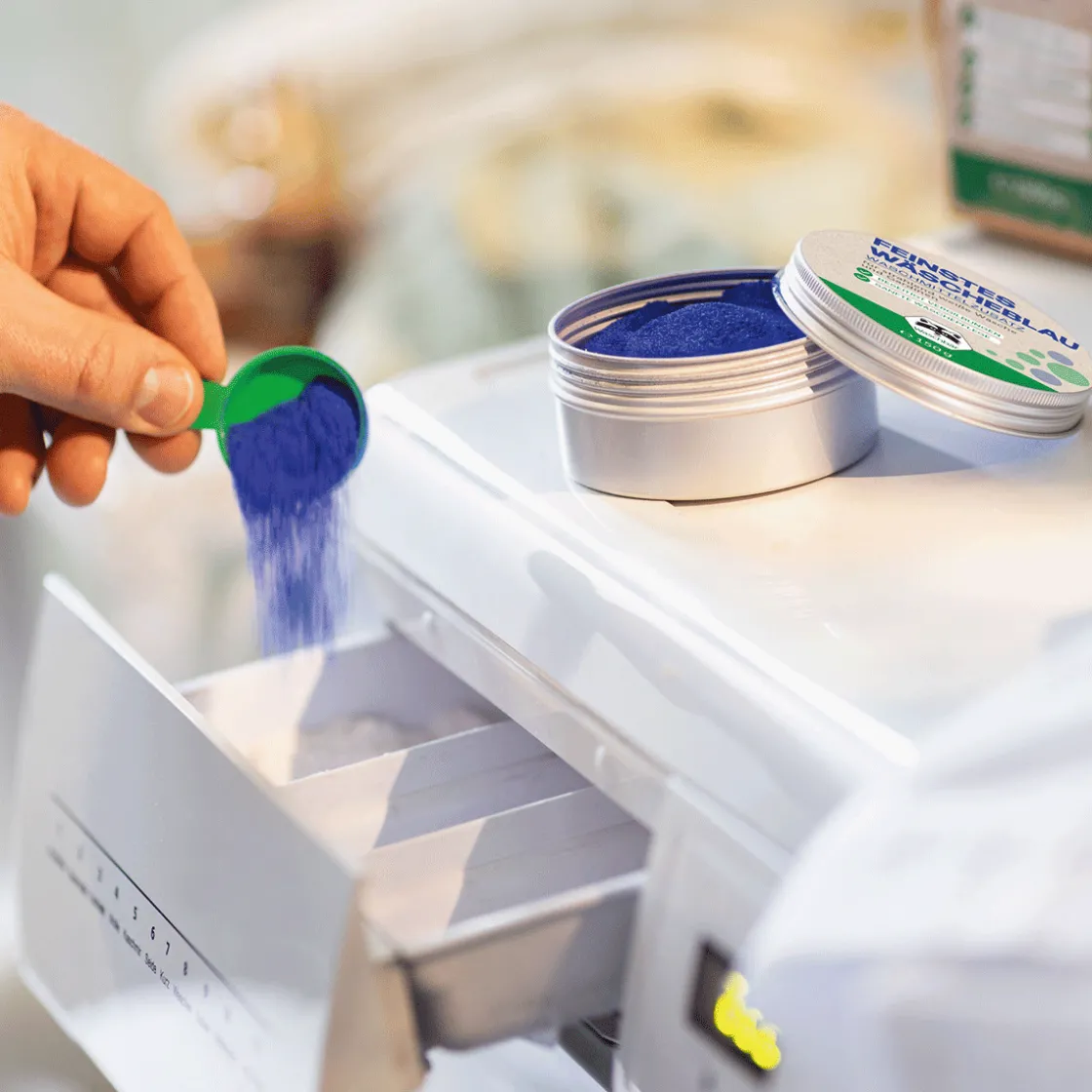 Endlich ist Schluss mit vergilbter Weißwäsche! Unser »Feinstes Wäscheblau« ist eins dieser wunderbaren Hausmittel, die sich schon seit Jahrhunderten bewähren. Dank Ultramarinblau – die Komplementärfarbe von Gelb – und Natron erhalten Textilien auf physikalische, also rein optische Weise, ohne chemische Bleichmittel, ihr strahlendes Weiß zurück. Insbesondere bei weißer Arbeitskleidung, aber auch bei T-Shirts, Socken etc. sorgt Wäscheblau in Pulverform für ein gepflegtes Aussehen Ihrer weißen Wäsche. Pflegen Sie Ihre Wäsche, ob Textil- oder Kunststofffasern, bei jedem Waschgang durch Zugabe von Wäscheblau – und genießen Sie das schneeweiße Ergebnis. Warum eigentlich Wäscheblau? Wer mit ökologischen Waschmitteln wäscht, hat sich vielleicht schon über die langsame Vergilbung seiner weißen Wäsche gewundert. Es liegt daran, dass diese Waschmittel keine optischen Aufheller enthalten. Deshalb greift man zu einem einfachen, physikalischen Trick: Man gibt beim Waschen einen blauen Farbstoff dazu, der als Komplementärfarbe von Gelb den unschönen Farbstich ausgleicht. Aufpassen sollte man lediglich bei der Dosierung. Nimmt man zu viel, kann die Wäsche einen leichten Blaustich bekommen. Dieser lässt sich allerdings schnell beseitigen – durch Zugabe von Zitronensäure in einem weiteren Waschgang.
