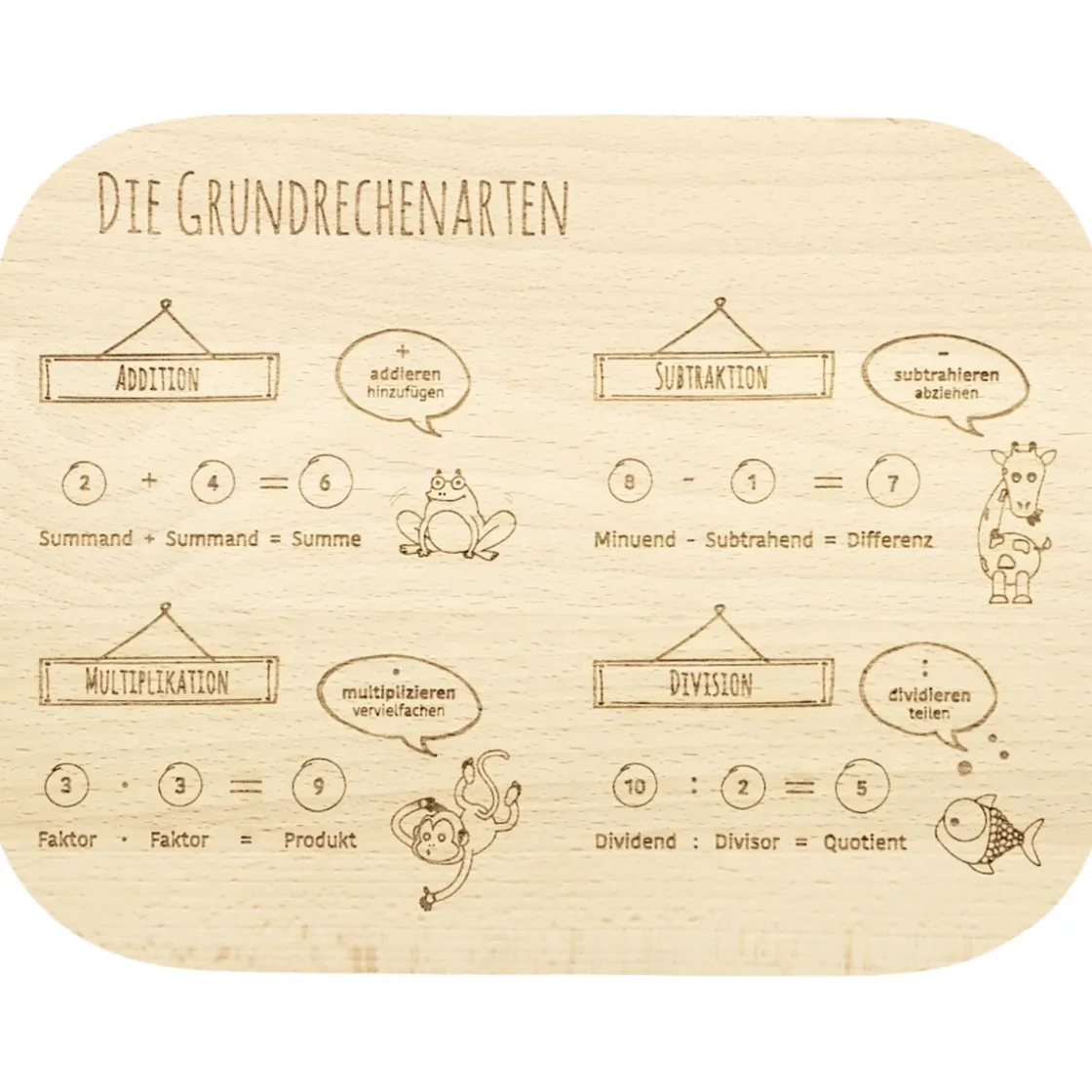 Was wäre es, wenn Ihr Kind schon beim Frühstück ganz nebenbei Mathe lernen würde? Mit diesem Lernbrettchen funktioniert es tatsächlich. Das innovative Frühstücksbrettchen aus Buchenholz macht schon beim Frühstück Lust auf Lernen. Die Grundrechenarten sind während der gesamten Grundschulzeit ein Dauerbrenner, der immer wieder geübt werden muss. Da ist es doch toll, wenn das Lernen so ganz nebenbei und spielerisch erfolgt: bei einer Mahlzeit mit Lerneffekt.