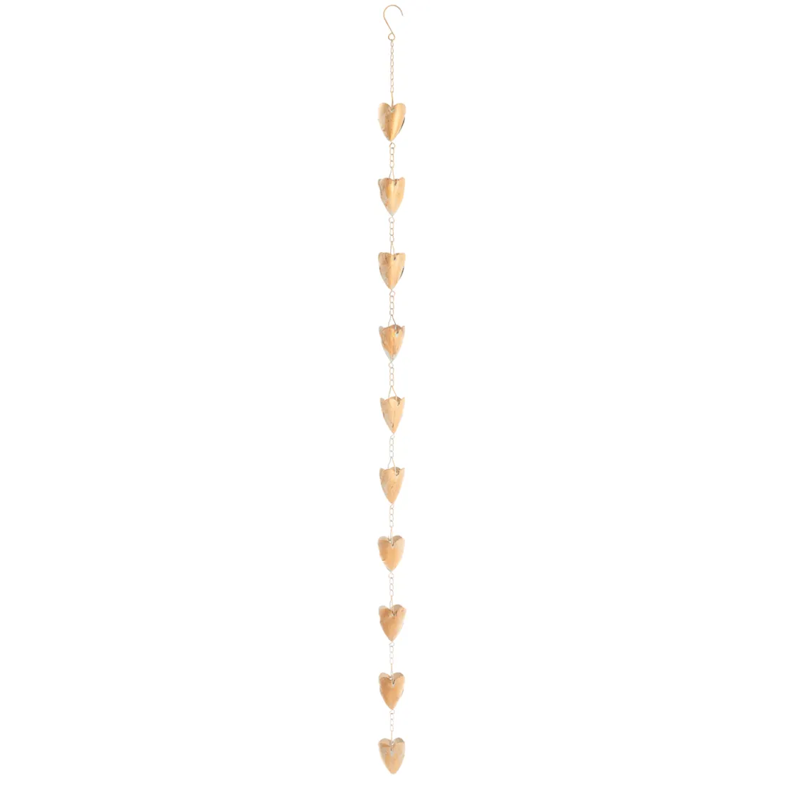 Romantisch schön ist diese Regenkette, die mit kleinen Herzen in einem antik-goldenen Ton geschmückt ist. Wenn Regen daran hinabläuft, wird sichtbar, wie wertvoll das Wasser für die Erde ist. Fühle dich eingeladen, auch dein Herz von seiner reinigenden und belebenden Kraft berühren zu lassen. Eisen, ca. L. 146 cm x B. 5,5 cm. Gewicht: ca. 340 g.