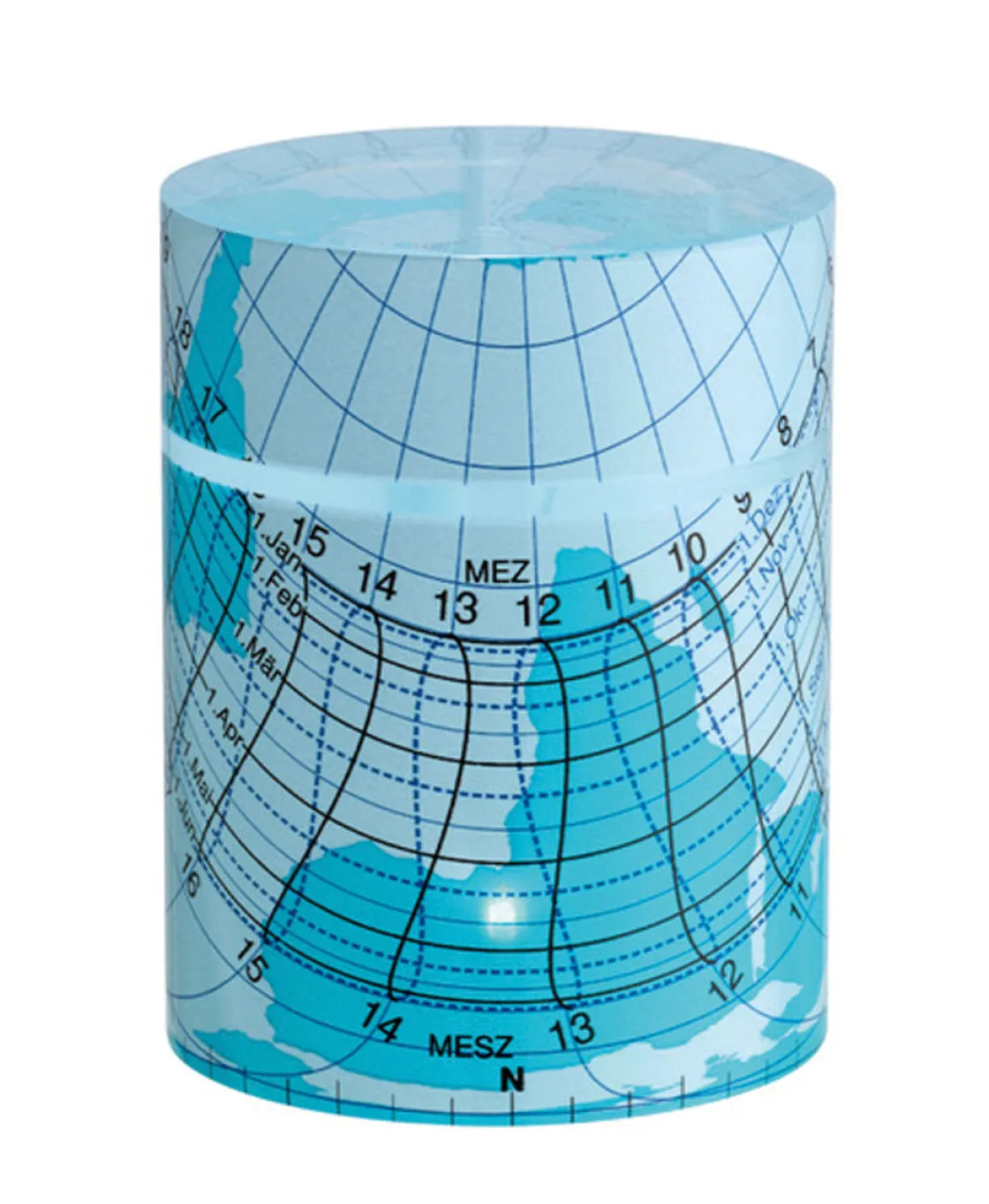 Diese Sonnenuhr aus Acrylglas zeigt die mitteleuropäische Zeit und das Datum an. Außerdem lässt sich mit diesem Zeitmesser der sogenannte subsolare Punkt verfolgen: auf einer Weltkarte, die auf dem Kopf steht. Dies ist der Ort in den Tropen, wo gerade die Sonne senkrecht über der Erde steht. Der Zeitpunkt des Sonnnenaufgangs und -untergangs ist für jedes jährliche Datum ablesbar. Diese Sonnenuhr ist für die Mitte Deutschlands berechnet. Wenn Sie dort in der Nähe leben, ist die Sonnenuhr bei Sonnenschein nach Ihrer Armbanduhr einstellbar. Sollten Sie weiter entfernt wohnen, können Sie den Zylinder, dem Breiten- und Längengraddifferenz Ihres Ortes zur Mitte Deutschlands entsprechend, kippen. Wie Sie dies genau machen, erfahren Sie im ausführlichen Anleitungsheft.