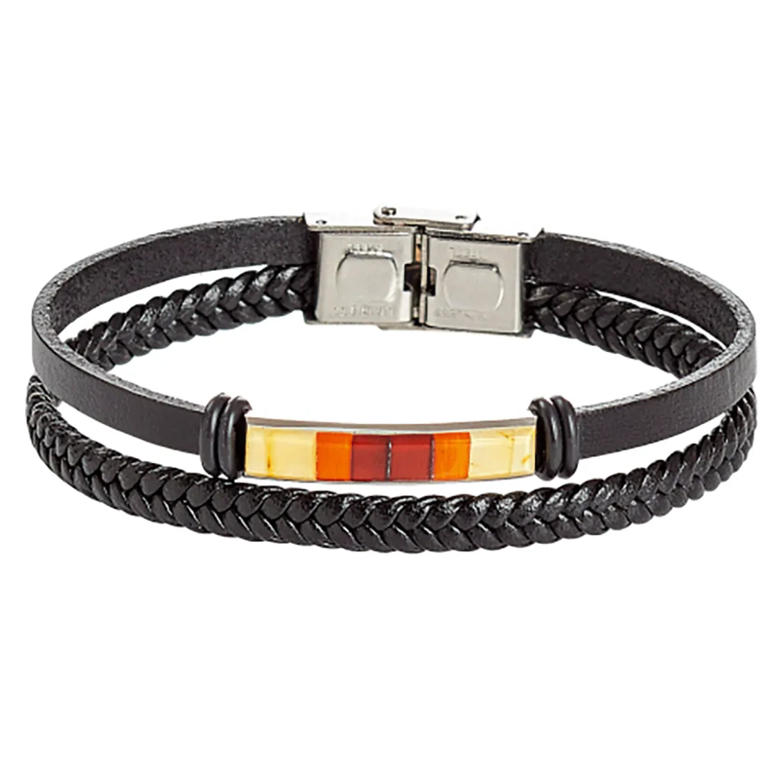 Stylisch und dabei klassisch schön ist dieses Armband, das aus einem geflochtenem und einem glatten Lederband besteht. In dieses wurden farblich abgestimmte Bernsteine in liebevoller Handarbeit eingefügt. Sie geben dem Schmuckstück eine energetische Ausstrahlung von Freude, Eleganz und Verlässlichkeit. Bernstein: Cognac, Gelb, Weiß, L. ca. 3 cm, Lederarmband ist individuell verstellbar L. ca. 19 cm, B. ca. 1 cm, Edelstahlschließe.