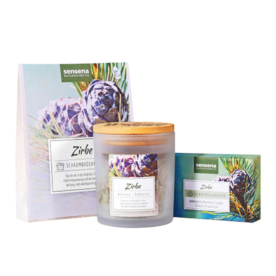 1 x Schaumbadekristalle »Zirbe«, 100 g, 1 x Schafmilchseife »Zirbe«, 100 g, 1 x Wellness-Duftkerze »Zirbe«, Brenndauer ca. 40 Std.