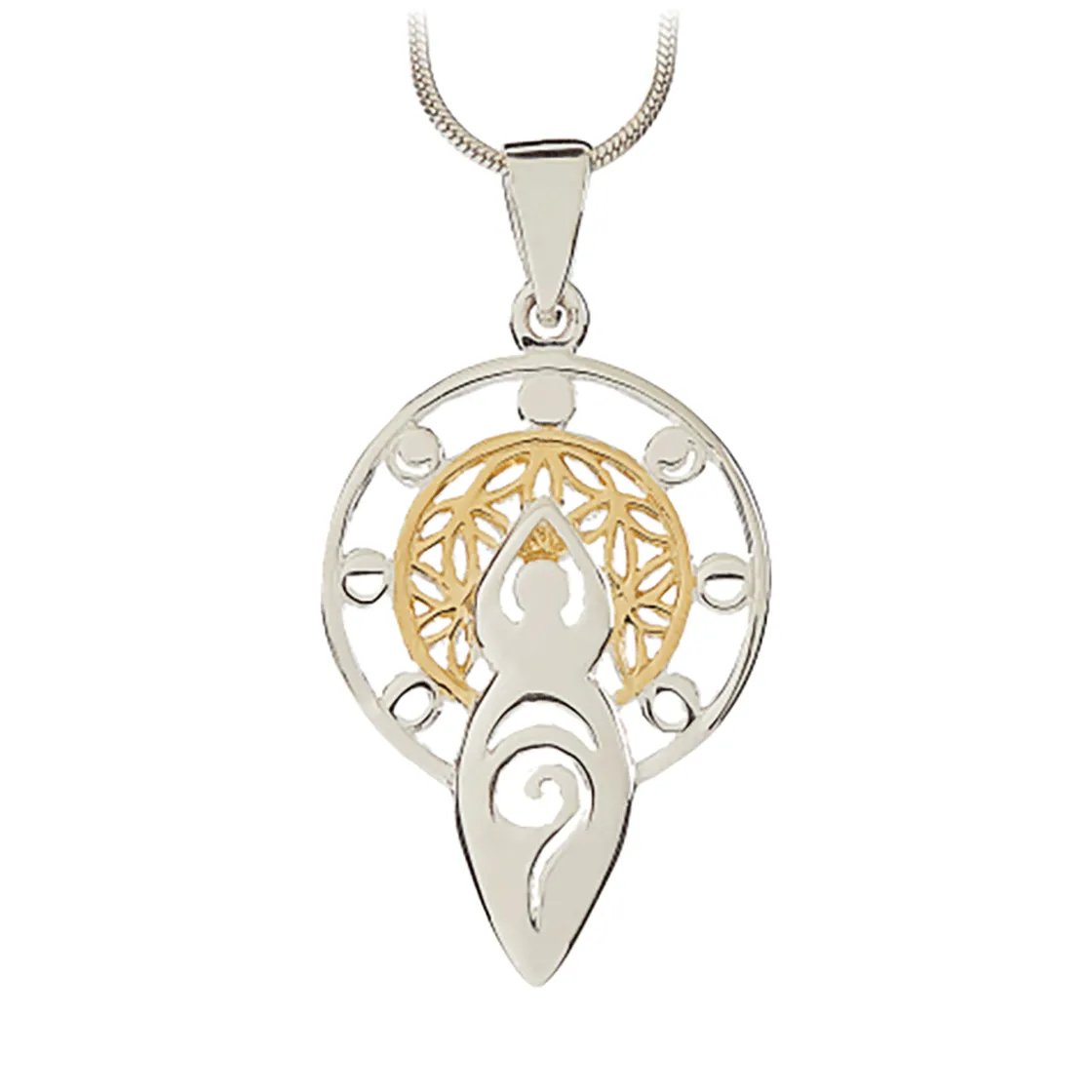 Dieses einzigartige Schmuckstück vereint die Kraft der Mondphasen, die Harmonie der vergoldeten Blume des Lebens, die Weisheit der Mondgöttin und die Energie der Spirale. Trage diese Kostbarkeit als Zeichen für Transformation, spirituelles Wachstum und Verbindung zur kosmischen Energie. H. ca. 3,3 x Ø ca. 1,7 cm, teilvergoldet, Silber 925.