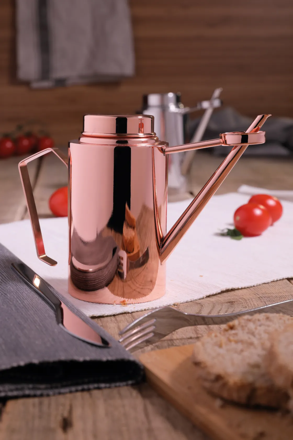 Kostbares Öl sparen und keinen Tropfen verschwenden! In dieser schönen Ölkanne aus rostfreiem Stahl, mit Kupferveredelung, ist ein ausgeklügeltes, patentiertes System dafür integriert: Eine Schale unter dem Ausgießer fängt die Öltropfen auf und führt sie durch das Rohr zurück in die Ölkanne. Öl-Nasen, die bis auf die Tischoberfläche herunterlaufen, gehören damit der Vergangenheit an. Der rostfreie Stahl ist ein Material, das die organoleptischen Eigenschaften des Öls über die Zeit bewahrt, indem es maximalen Schutz vor Licht, Luft und Gerüchen garantiert und Oxidations- und Veränderungsprozesse verhindert. Die Kupferveredelung und das Vintage-Design erinnern dazu an traditionelle Küchengeräte aus Kupfer. Leicht zu reinigen und zu befüllen. Hergestellt in Italien.