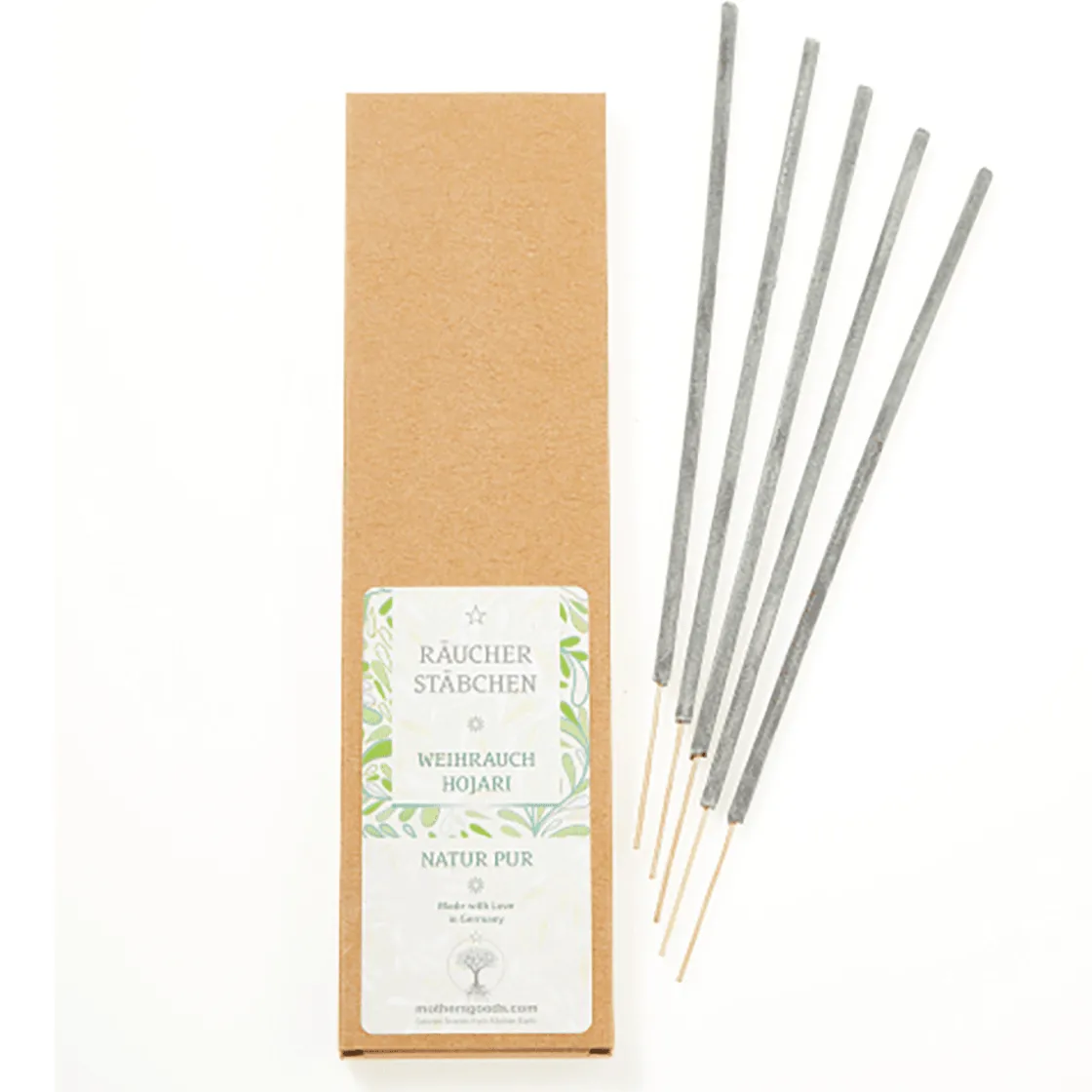 Der beliebteste Weihrauch ist der Weihrauch aus dem Oman. Nun endlich kann man den Duft und die Atmosphäre des besonderen Hojari Weihrauchs in Stäbchen genießen. Du hältst mit diesen »Hojari«-Räucherstäbchen ein einzigartiges, duftendes Naturprodukt in deinen Händen. Die Räucherstäbchen »Hojari« sind naturrein und frei von Parfum und Abbrennhilfen – wie alle unsere selbst hergestellten Räucherstäbchen.