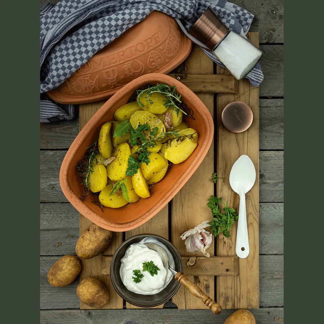 Vor allem berufstätige Paare werden die Vorzüge des Römertopfs »Bräter Klassik« schnell zu schätzen wissen. Am Morgen vor Arbeitsbeginn kann bereits eingefüllt werden, was abends auf den Tisch kommen soll. Nach Feierabend wird das Ganze dann aus dem Kühlschrank geholt und in den Herd geschoben. So geht gesunde, fettarme – auf Wunsch auch gern fettfreie – und äußerst schmackhafte Küche heute. Vitamine und andere Nährstoffe bleiben im Römertopf-Bräter weitestgehend erhalten und die geschmacklichen Eigenschaften von Fleisch, Fisch und Gemüse können sich optimal entfalten. Doch der kleine Bräter ist nicht nur beim Kochen ein zuverlässiger Küchenhelfer. Er sieht so gut aus, dass er vom Herd direkt auf den Tisch darf und somit die Servierschüssel überflüssig macht. Auch nach dem Essen ist der Römer-Bräter denkbar unkompliziert. Er lässt sich mühelos von Hand reinigen, darf aber ebenso gern auch in die Spülmaschine.