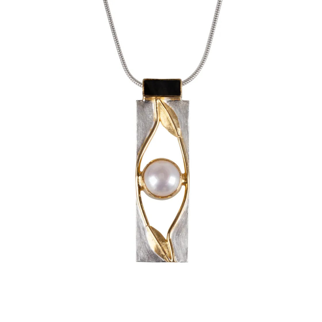 Ganz im Stil des Art déco ist diese filigrane Kette kreiert! An einer 42 cm langen Silberkette sehen Sie einen länglichen Anhänger, der aus 925er Sterlingsilber besteht, das in Form von Blättern seitlich vergoldet wurde. In der Mitte thront eine Süßwasserzuchtperle und oben wird der Anhänger noch von einem schwarzem Onyx begleitet. Der stilvolle Schmuck macht sich besonders gut zu Blusen und Pullovern sowie festlichen Kleidern, allen voran in der klassischen Farbe Schwarz. Das feine Schmuckstück wurde übrigens von versierten Schmuckkünstlern auf Bali gefertigt, denn dort lässt die englische Designerin, Paula Bolton, seit Jahrzehnten ihr Kreationen umsetzen. Die balinesischen Familien, die Boltons Schmuck liebevoll und gekonnt anfertigen, sind mittlerweile zu ihren Freunden geworden und so kooperieren zwei sehr unterschiedliche Kulturen in fast perfekter Harmonie! Die Handwerker auf Bali haben ihre Fähigkeiten von Generation zu Generation weitergegeben und durch Paula Bolton wird ihre Kunst weiterhin geschätzt. Sehen Sie sich deshalb gerne noch weitere Schmuckstücke, auch zu dieser Kette passende, von Paula Bolton hier bei uns im Onlineshop an!