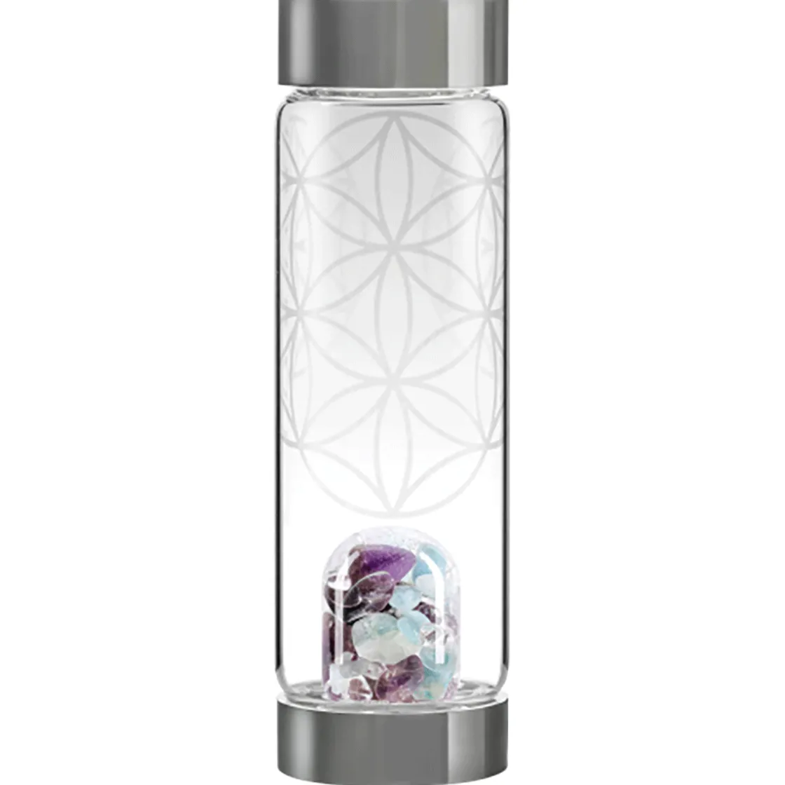Die exklusive Komposition aus Amethyst, Aquamarin und Bergkristall vermittelt pure Frische! In Verbindung mit dem kraftvollen Symbol der Blume des Lebens auf dem Glaskörper der ViA schafft diese Sonderedition eine einzigartige Energie. Die VitaJuwel-Edelsteinflasche ViA ist der perfekte Begleiter für außergewöhnliche Momente. Die Glasflasche aus temperaturbeständigem und robustem Borosilikatglas lässt sich wunderbar auch unterwegs auffüllen, so hat man Edelsteinwasser immer und überall dabei. Das getrennt verschraubte Edelsteinmodul im Inneren der Flasche beinhaltet ausschließlich fair gehandelte, handverlesene und sorgfältig gereinigte Edelsteine und ist austauschbar.