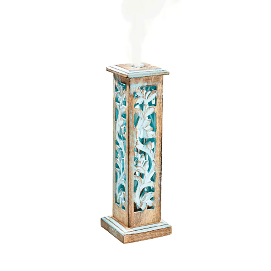 Magisch schön ist dieser Räucherturm mit seinen Blütenranken und der türkisen Lasur. Beim Verglimmen von Räucherstäbchen und -kegeln bleibt die Asche im Inneren, während faszinierende Rauchsäulen aufsteigen. Mangoholz, H. 31 x B. 10 cm.
