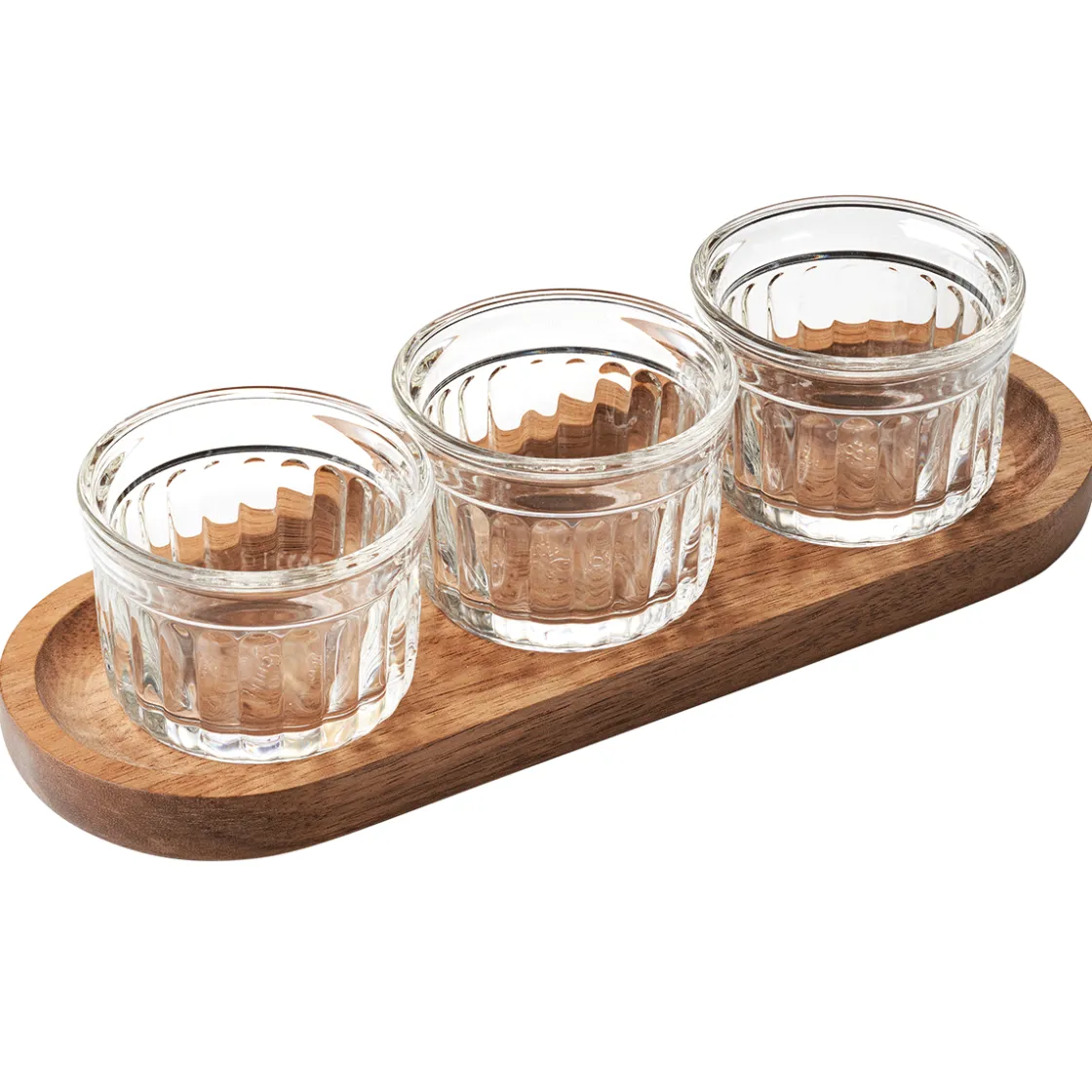 Dieses Set aus drei Serviergläschen und einem Tablett aus Akazienholz ist praktisch und ästhetisch zugleich. Mit diesem Servierset verleihen Sie jedem Aperitif oder Digestif das gewisse Etwas. Die drei zart gerippten Glasschalen eignen sich perfekt zum Servieren von kalten Vorspeisen wie Oliven oder Fischrillette und Dips wie Guacamole. Auch für kleine Törtchen lassen sich die Formen nutzen, da sie im Backofen bis auf 200 Grad erhitzbar und spülmaschinenfest sind.