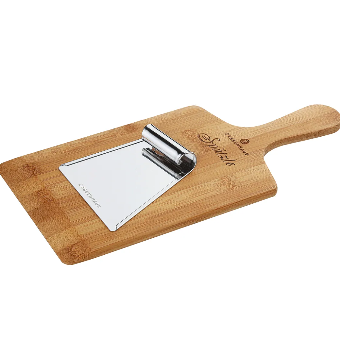 Traditionelle Speise trifft auf modernen Umweltschutz. Das Spätzlebrett von Zassenhaus ist perfekt geeignet für die Herstellung der schwäbischen Spezialität. Es hat einen ausreichend langen Griff und ist breit genug, um langen Spätzle Platz zu bieten. Die untere Kante ist abgeschrägt, damit Sie den Teig besser vom Brett schaben können. Das klappt am besten, wenn Sie das Brett vorher anfeuchten und den zähflüssigen Teig dünn auf die untere Hälfte streichen. Dann kommt der robuste Schaber aus Edelstahl zum Einsatz – mit ein wenig Übung haben Sie den Bogen raus. Das Brett ist bestens auf häufige Nutzung eingestellt. Es ist aus nachhaltig angebautem Bambus gefertigt. Dieser Rohstoff wächst schnell nach, ist langlebig und messerschonend. Tipp: Mit speziellem Spätzlemehl gelingen die Nudeln besonders gut. Es ist sehr feinkörnig, so wird der Teig schön elastisch und bleibt gleichzeitig beim Kochen fest.