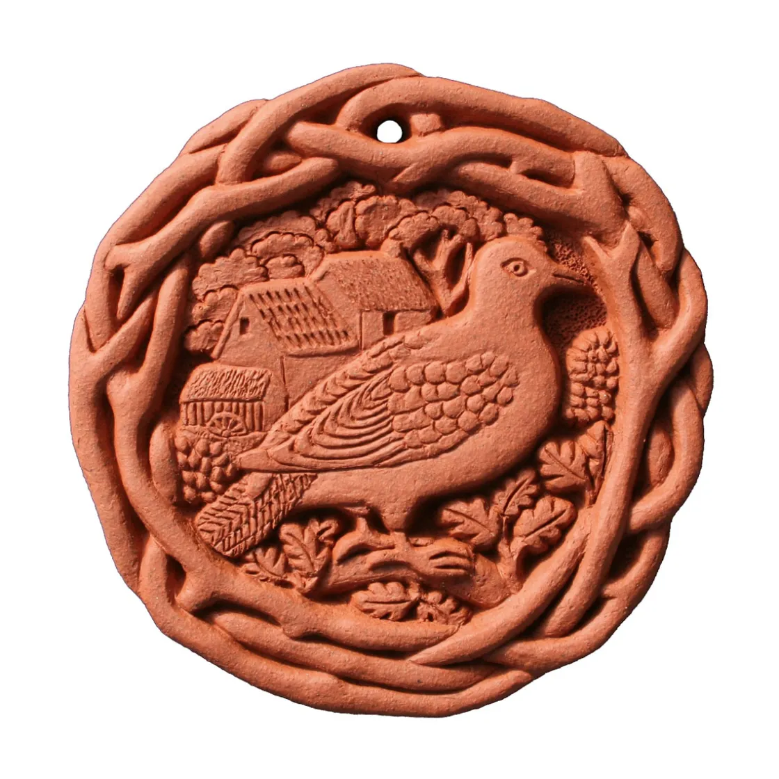 Ø 9,8 cm, handgebranntes Terrakotta, frostsicher, 1 Lochbohrung zur Aufhängung oben, handgefertigt in England.