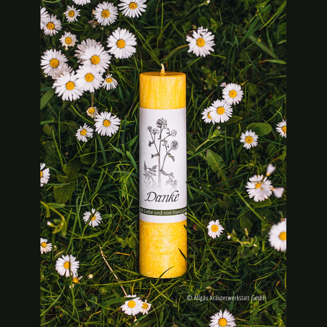 Unterstützt durch den reinigenden und heiligen Aspekt des Salbeis ist die Danke- Heilkräuterkerze mit ihren Inhaltsstoffen von Gänseblümchen, Ringelblume und Sonnenblume – wie ein frischer Strauß Blumen – eine kleine Erkenntlichkeit und Erinnerung, um einem lieben Menschen Danke zu sagen für seine Freundschaft, Hilfe oder Unterstützung. Eine kleine Manufaktur in den Allgäuer Alpen stellt die von Hand gegossenen Kostbarkeiten her, die so schön gleichmäßig abbrennen. Grundlage bilden 100% pflanzliche Stearine aus Resten der europäischen Olivenölproduktion. Hinzugefügt werden Pflanzen oder Harzauszüge, Heilkräuteressenzen, naturreine Öle und Tinkturen aus biologischem Anbau oder Wildsammlung. Das Gelb der Heilkräuterkerze erinnert an wärmende Sonnenstrahlen – und auch daran, dass man vielleicht viel häufiger Momente der Dankbarkeit zelebrieren sollte.