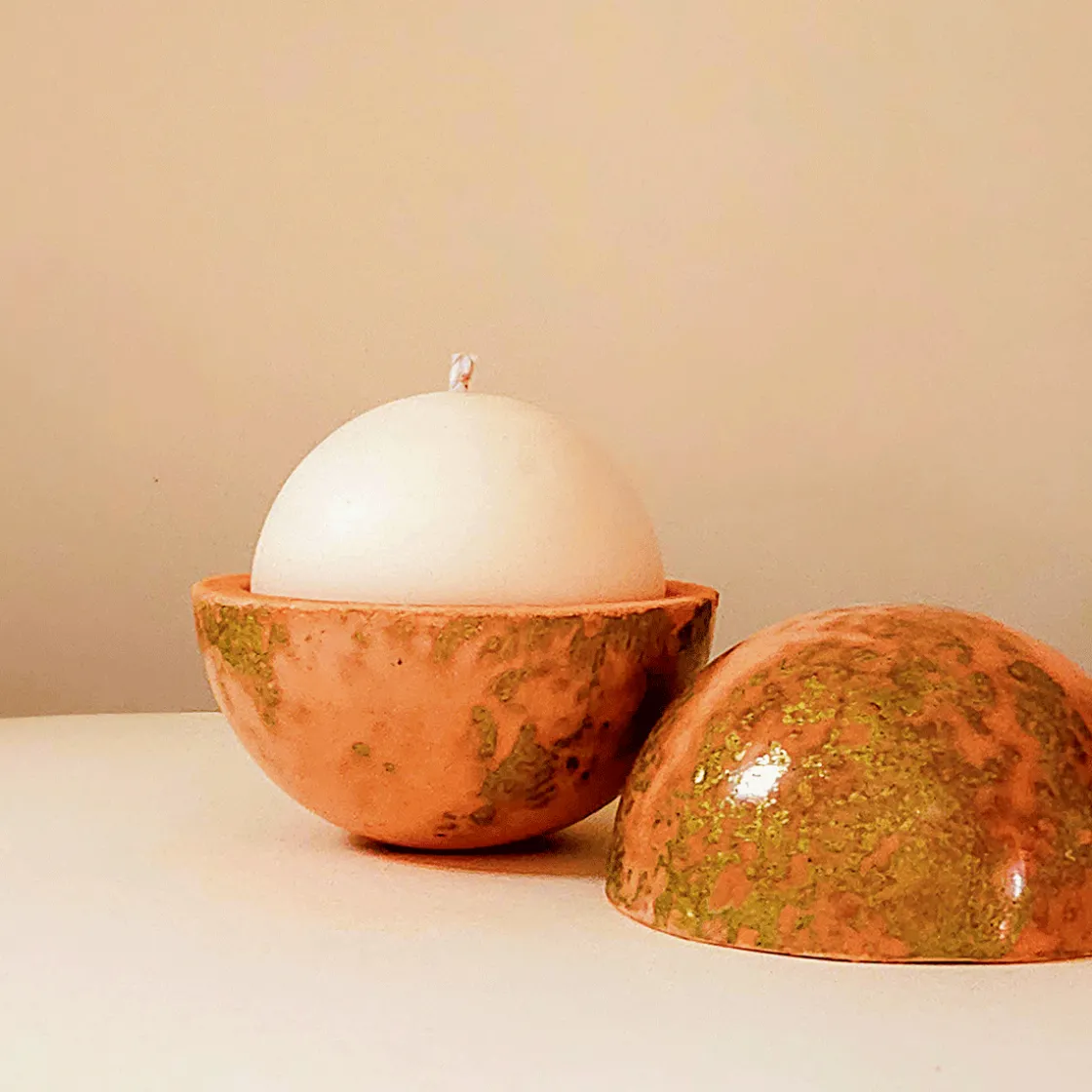 Im Inneren dieser golden schimmernden Kugel verbirgt sich eine handgefertigte Kerze, deren feiner Duft nach Orangenblüten den südlichen Sommer heraufbeschwört. In einer kleinen Manufaktur im Loire-Tal fertigt Hélène Chevereau diese besonderen Duftkerzen, inspiriert von der Natur, die sie umgibt. Ihr Credo ist es, Geschichten zu erzählen, die einen neuen Blick auf die Welt ermöglichen. Die Düfte ihrer Kerzen sollen anregen und auf Gedankenreisen begleiten, die Globus- oder Muschelform der Kerze versinnbildlicht dabei das Geheimnisvolle, Endlose des Kreises, der den Lauf der Natur und des Kosmos repräsentiert. Hergestellt werden die duftenden Globen in Handarbeit aus reinem Rapswachs, bei ihrer Verbrennung werden keine keine giftigen oder umweltschädlichen Substanzen freigesetzt. Die Textur der Kerzen ist cremig und glatt, sei brennen langsam ab und erzeugen eine sehr weiche Flamme. Alle Duftkerzen sind biologisch abbaubar, gentechnikfrei, pestizidfrei und nicht an Tieren getestet. Der feine und beruhigende Duft nach Orangenblüte ist das Ergebnis einer Zusammenarbeit mit dem renommierten Parfümhaus Galimard aus Grasse in der Provence. Die Kugel, die die Kerze umschließt, wird aus dem Werkstoff Jesmonit gefertigt, ein ungiftiges und umweltfreundliches Material, das Farbpigmente mit Metallpulver kombiniert, wodurch ein zufälliges und einzigartig edles Aussehen entsteht.