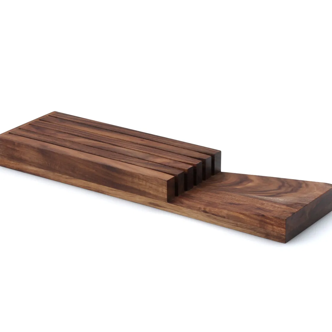 Schafft Ordnung und sieht nebenbei gut aus: Der Messerblock für die Schublade schützt die Klingen Ihrer Messer und sorgt gleichzeitig dafür, dass Sie sich beim Hineingreifen nicht schneiden. Das exklusive Ordnungssystem ist aus nachhaltig angebautem dunklem Akazienholz per Hand gefertigt. Das Hartholz wurde fein geschliffen und geölt – so bleibt die schöne Holzstruktur lange erhalten und ermöglicht eine leichte Pflege. Der nur elf Zentimeter breite Platzsparer passt in gängige Schubladen und bietet Raum für fünf unterschiedlich große Messer. Er darf aber gern in Sichtweite bleiben: Als Objekt auf dem Regal oder auf der Arbeitsfläche macht er sich auch wunderbar. Pflegehinweis: Zum Reinigen des Messerblocks wischen Sie ihn einfach feucht ab und lassen ihn stehend trocknen.