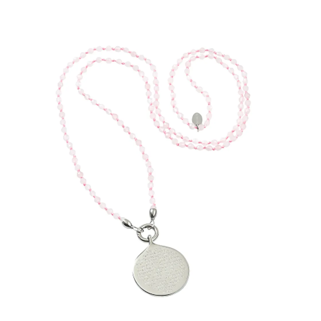Kette ca. 80 cm, Anhänger Ø ca. 3 cm, Edelstahl, facettierter Rosenquarz.
