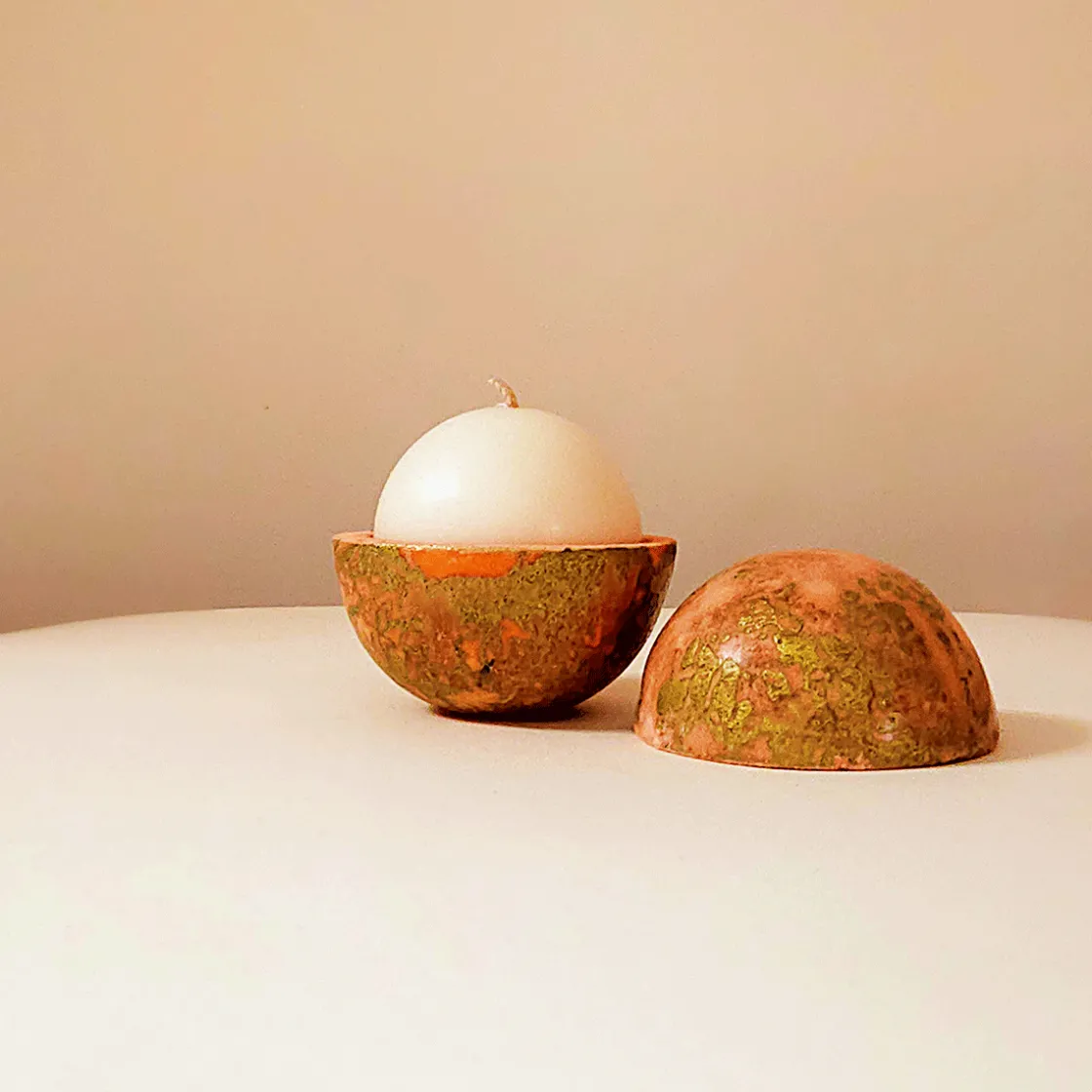 Im Inneren dieser golden schimmernden Kugel verbirgt sich eine handgefertigte Kerze, deren feiner Duft nach Orangenblüten den südlichen Sommer heraufbeschwört. In einer kleinen Manufaktur im Loire-Tal fertigt Hélène Chevereau diese besonderen Duftkerzen, inspiriert von der Natur, die sie umgibt. Ihr Credo ist es, Geschichten zu erzählen, die einen neuen Blick auf die Welt ermöglichen. Die Düfte ihrer Kerzen sollen anregen und auf Gedankenreisen begleiten, die Globus- oder Muschelform der Kerze versinnbildlicht dabei das Geheimnisvolle, Endlose des Kreises, der den Lauf der Natur und des Kosmos repräsentiert. Hergestellt werden die duftenden Globen in Handarbeit aus reinem Rapswachs, bei ihrer Verbrennung werden keine keine giftigen oder umweltschädlichen Substanzen freigesetzt. Die Textur der Kerzen ist cremig und glatt, sie brennen langsam ab und erzeugen eine sehr weiche Flamme. Alle Duftkerzen sind biologisch abbaubar, gentechnikfrei, pestizidfrei und nicht an Tieren getestet. Der feine und beruhigende Duft nach Orangenblüte ist das Ergebnis einer Zusammenarbeit mit dem renommierten Parfümhaus Galimard aus Grasse in der Provence. Die Kugel, die die Kerze umschließt, wird aus dem Werkstoff Jesmonit gefertigt, ein ungiftiges und umweltfreundliches Material, das Farbpigmente mit Metallpulver kombiniert, wodurch ein zufälliges und einzigartig edles Aussehen entsteht.