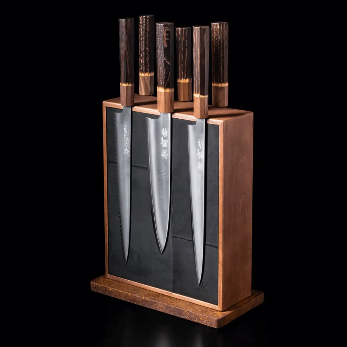 31 x 25 x 13 cm, beidseitig magnetisch, für 6 Messer – max. Klingenlänge 27 cm (nicht für Keramikmesser), Rindleder, geöltes Buchenholz, Sockel Cortenstahl, handgefertigt in Deutschland, Lieferung ohne Messer.